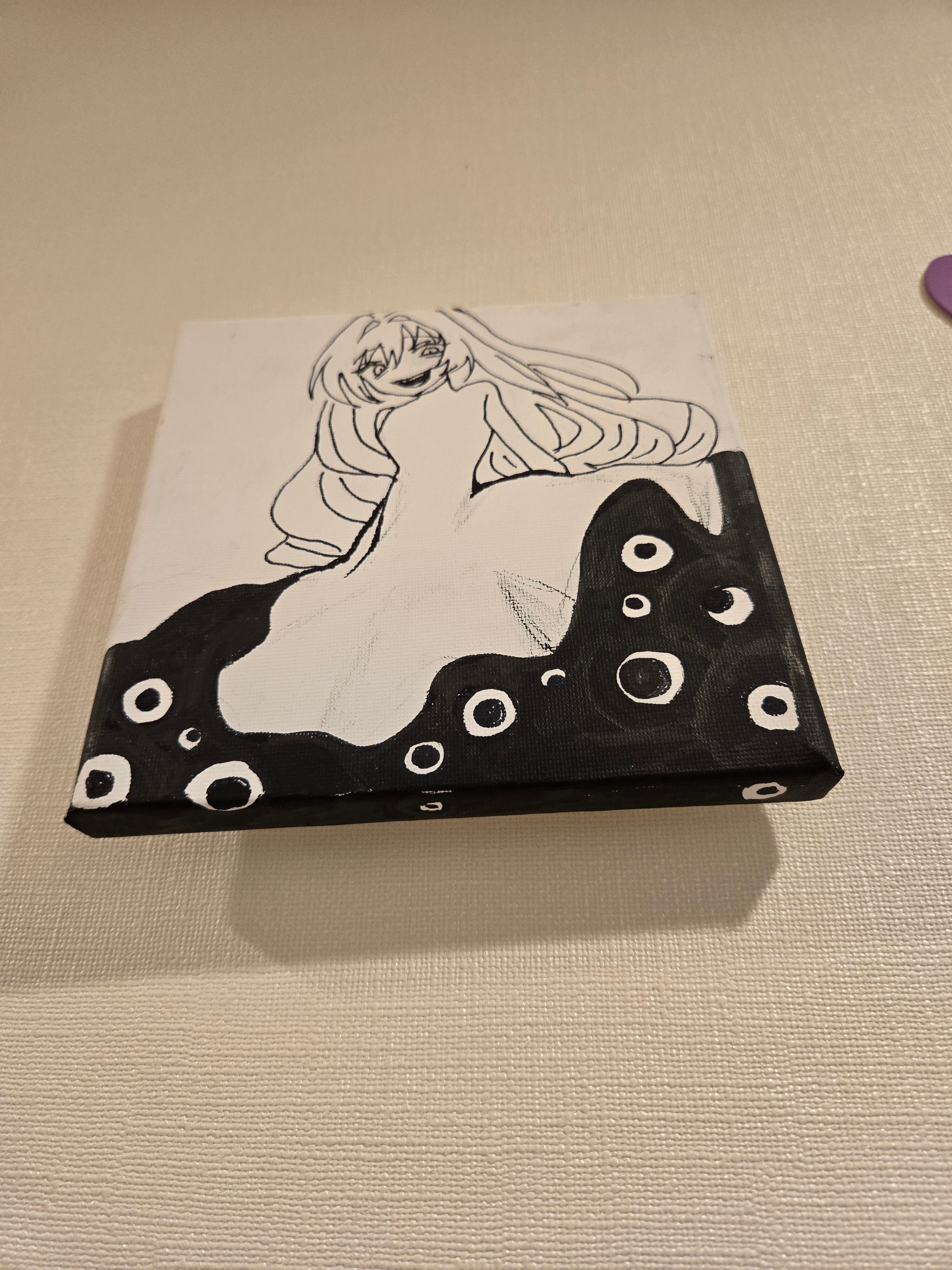 キャンバスサイズは15cm×15cmです。モノクロで油彩ペンを用いています。縁にちょっとしたアクセントを付けてみました。